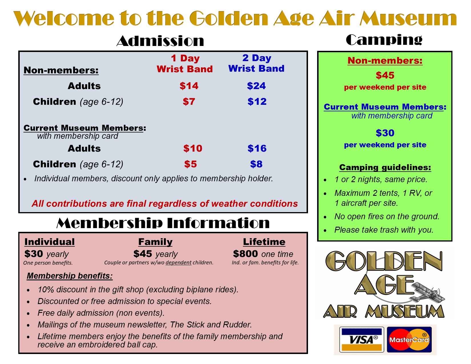 | Gate Admission: Adults $10, Child 6-12 $5, under 6 free, Current museum members $5. | |